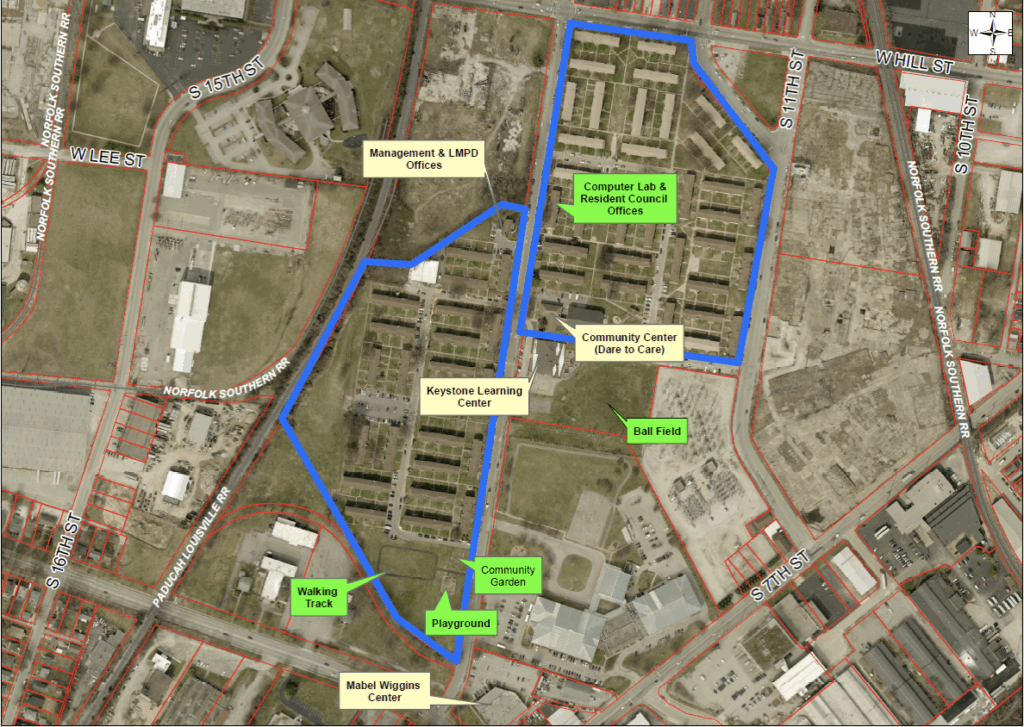 Management and Maintenance offices are located on-site And the Louisville Metro Police Department has a satellite office within that same building. A computer lab and the resident council office is located across from the Management office. The site also offers a small community garden for residents, with an adjacent playground and paved walking track.